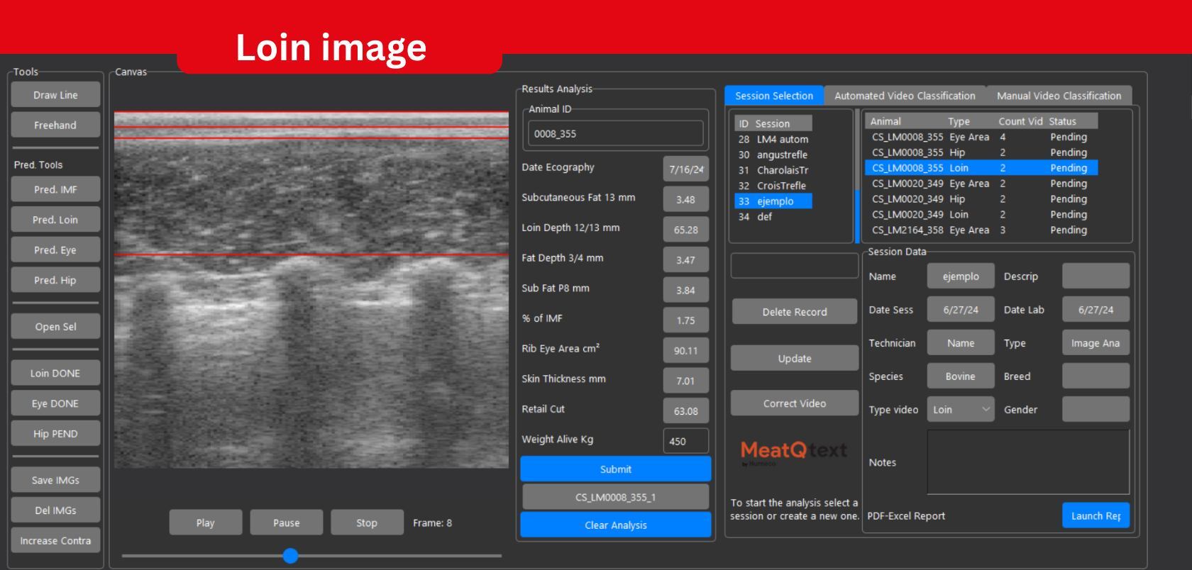 The MeatQtext software allows for the objective measurement of loin fat infiltration, subcutaneous fat, ribeye area, and muscle depth. All of these measurements are taken in the live animal, making it possible to apply them in genetic selection or in feedlot management.